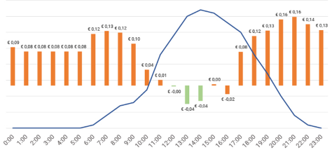 Hoe zien de tarieven van een dynamisch energiecontract eruit? Hieronder een voorbeeld hoe dagelijks de prijzen door de markt worden vastgesteld en gedeeld. De tarieven zijn voor 24 uur vast en de nieuwe tarieven worden iedere dag om 13:00 voor de dag erop gepubliceerd.